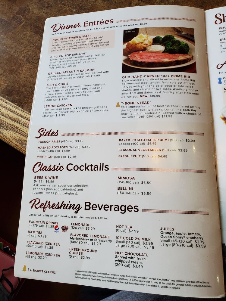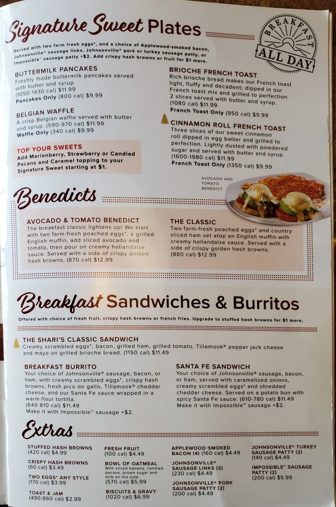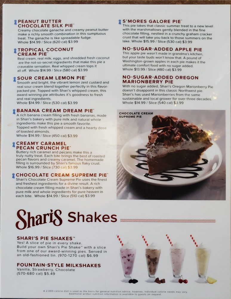 Introducing the menu at Shari’s Cafe and Pies, where you can enjoy a variety of delicious options from omelettes & scrambles like B.Y.O. Omelette and Spring Omelette, to classic favorites like The Breakfast Sampler and Meat Lover's Skillet. Indulge in signature sweets like Buttermilk Pancakes and Cinnamon Roll French Toast for a delightful treat. Customers rave about the cozy country town cafe vibe, friendly service, and scrumptious dishes. Don't miss out on their famous pies that are a must-try! Whether you're in the mood for breakfast, brunch, lunch, dinner, or even a late-night snack, Shari's Cafe and Pies has something to satisfy your cravings. Stop by for a memorable dining experience and enjoy the comfort and taste of Shari’s Cafe and Pies.